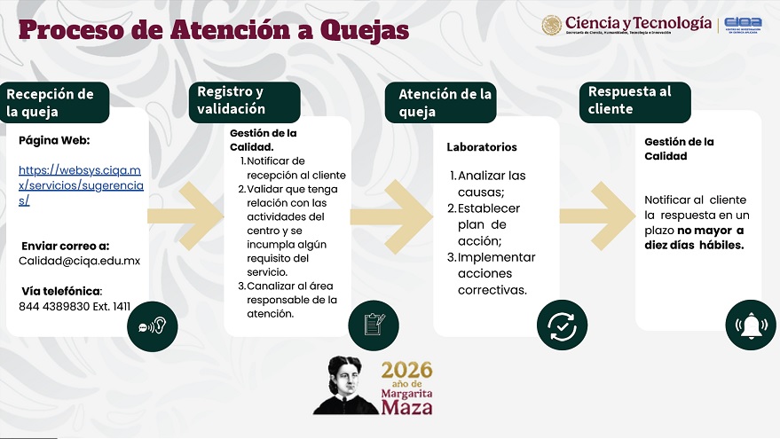 En caso de que decida presentar una felicitación, queja o sugerencia, hacemos de su conocimiento que la información relacionada es tratada bajo los principios de confidencialidad, ética e imparcialidad que tenemos en el Centro de Investigación en Química Aplicada